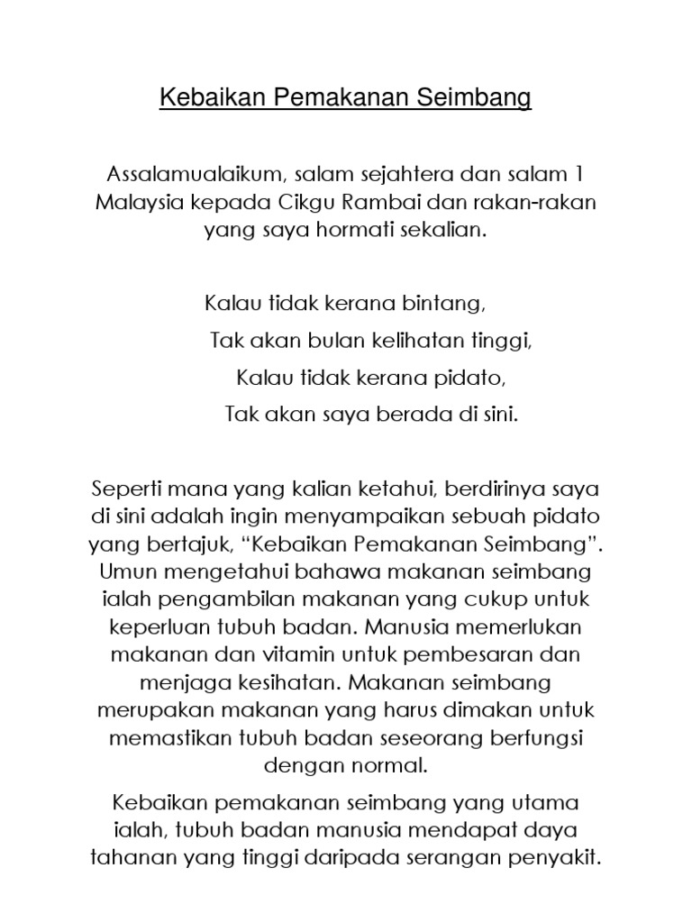 Penggunaan Peribahasa Dalam Karangan Bahasa Melayu Mengikut Tema 1. Satu amalan yang penting untuk diamalkan adalah dengan mengambil makanan yang seimbang. Masyarakat yang tidak mengamalkan pemakanan yang seimbang akan mudah untuk dijangkiti penyakit berjangkit.